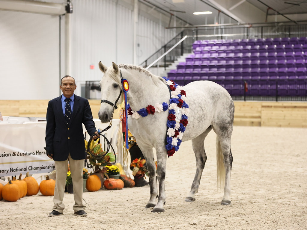 This stallion is NOT for sale. The price listed is the stud fee for purebred Andalusian or Lusitano mares. Crosses to other breeds are $1250. Breeding fees due at time of service; but stud fee not due until mare is confirmed in foal. Venerable is a 9 times national champion at halter and under saddle, including National Champion 4th level dressage in 2023 and Pre St George in 2024, now showing Intermediate I. He has an outstanding pedigree with 3 olympians, national champions and breed improvement stallions. HIs sire, Distinguido X, is the World Equestrian Games Bronze medalist, his Grandsire, Evento, has Elite status with 4 ANCCE stamps and was in 2 olympics. Evento was sired by Leviton, another olympian and #2 horse in the Spanish Book of Merits. Venerable's dam is our imported 3 ANCCE stamp mare Espinilla PLC. Espinilla has been National Champion and Best Movement Adult horse at the IALHA national show under the judge from Spain. His first foals will arrive in spring 2024.